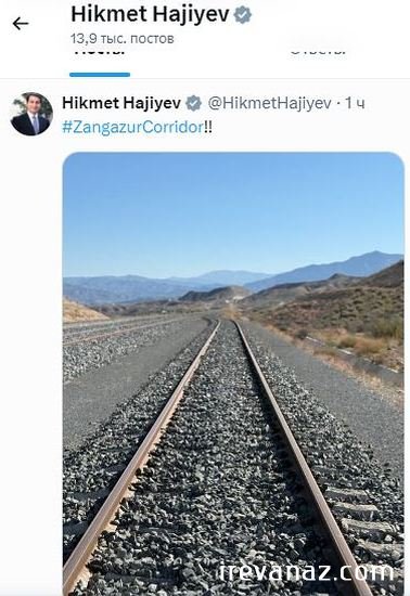 «Զանգեզուրի միջանցք»․ այդպիսի մակագրությամբ է Ադրբեջանի նախագահ Իլհամ Ալիևի օգնական Հիքմեթ Հաջիևը գրառում արել «X»-ում և հրապարակել ։Ադրբեջանի նախագահ Իլհամ Ալիևը հայտարարել էր, որ «Զանգեզուրի միջանցքի» բացումը կարող է տեղի ունենալ մինչև 2028 թվականի վերջը։